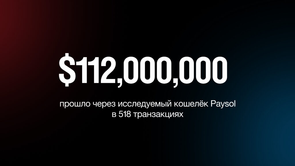 Указанный кошелёк обработал 518 транзакций на сумму свыше $112 млн. Среди прочего, этот кошелёк осуществлял переводы на адреса, связанные с Garantex Europe OÜ – эстонской компанией, попавшей под санкции США в апреле 2022 года. 25 декабря 2024 года на кошелёк поступило $234 366,39 с адреса, связанного с Garantex. Менее чем через месяц, 17 января 2025 года, $2,66 млн были переведены с этого кошелька на другой адрес, который мы идентифицировали как операционный кошелёк Paysol, именно его нам предоставили для тестовой транзакции.